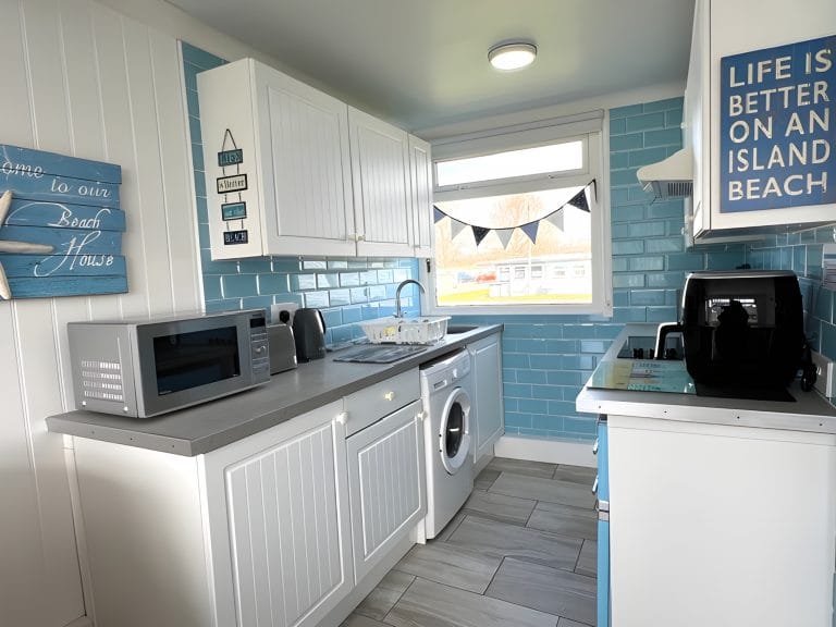 Sandy Shores is a bright and welcoming south-facing chalet, perfectly positioned at the end of a peaceful terrace. Its fully enclosed patio area, with balustrade, outdoor table, parasol and seating, overlooks an open green, creating the perfect spot for relaxed al fresco meals after a day by the sea.
