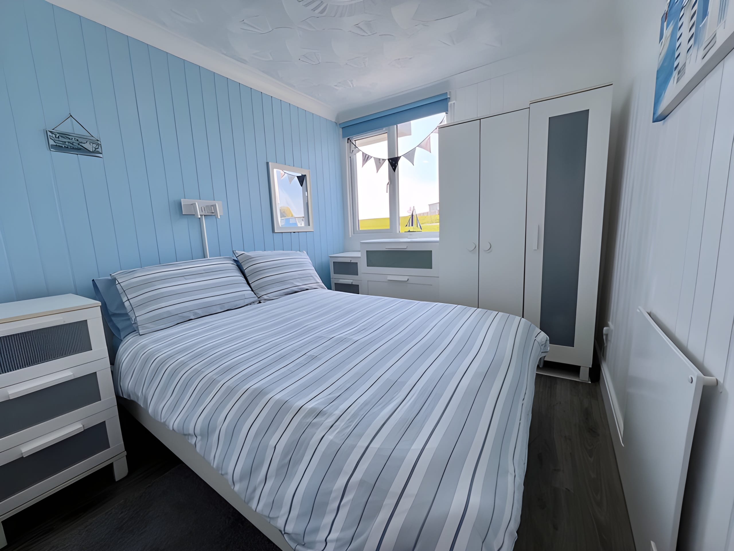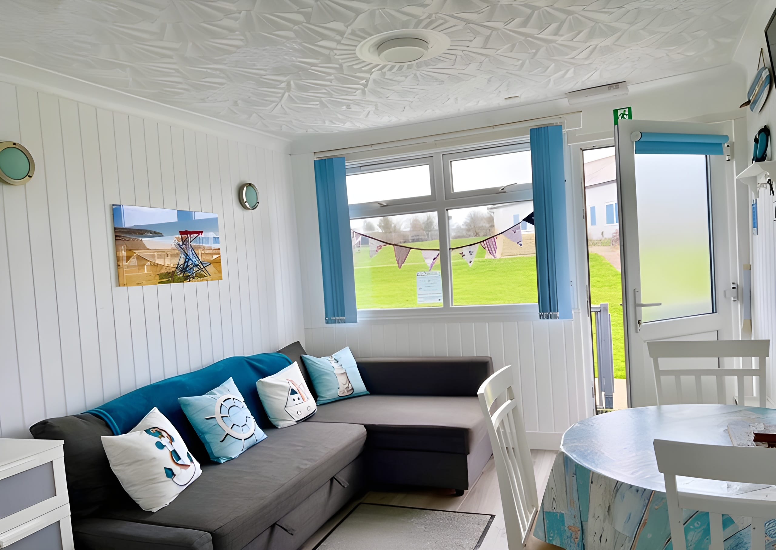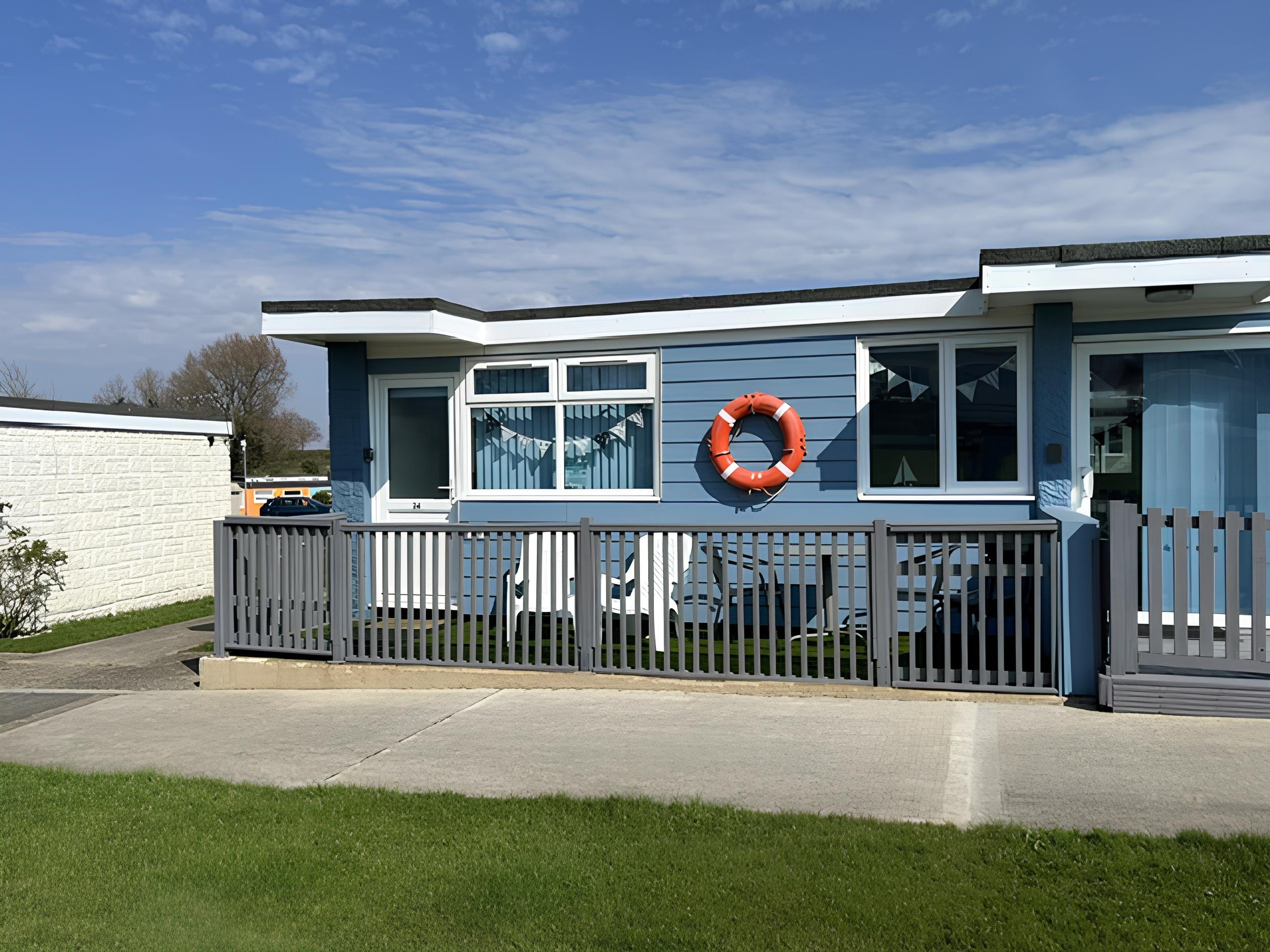 Sandy Shores is a bright and welcoming south-facing chalet, perfectly positioned at the end of a peaceful terrace. Its fully enclosed patio area, with balustrade, outdoor table, parasol and seating, overlooks an open green, creating the perfect spot for relaxed al fresco meals after a day by the sea.